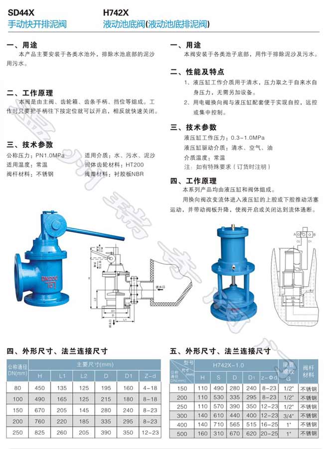 本產品由手動控制裝置和角式閥體組成.當手柄向下(由A至B)給壓力時,使閥瓣打開(即排泥閥打開),與此同時可用手動裝置頂上的一個定位滑塊和螺栓來固定其位置;當手柄無壓力時,使閥瓣關閉即排泥閥關閉.