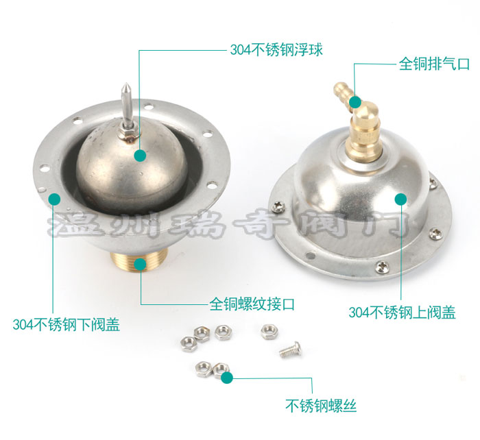 此排氣閥為本廠為市場所生產的新型排氣閥,此不銹鋼立式排氣閥比傳統的排氣閥排氣量大,排氣閥中間部分是正宗304不銹鋼材質 ,不生銹 ,排氣閥的上部有可接軟管, 底部亦有過濾網防止管道內過大物質將浮球不能歸位的現象